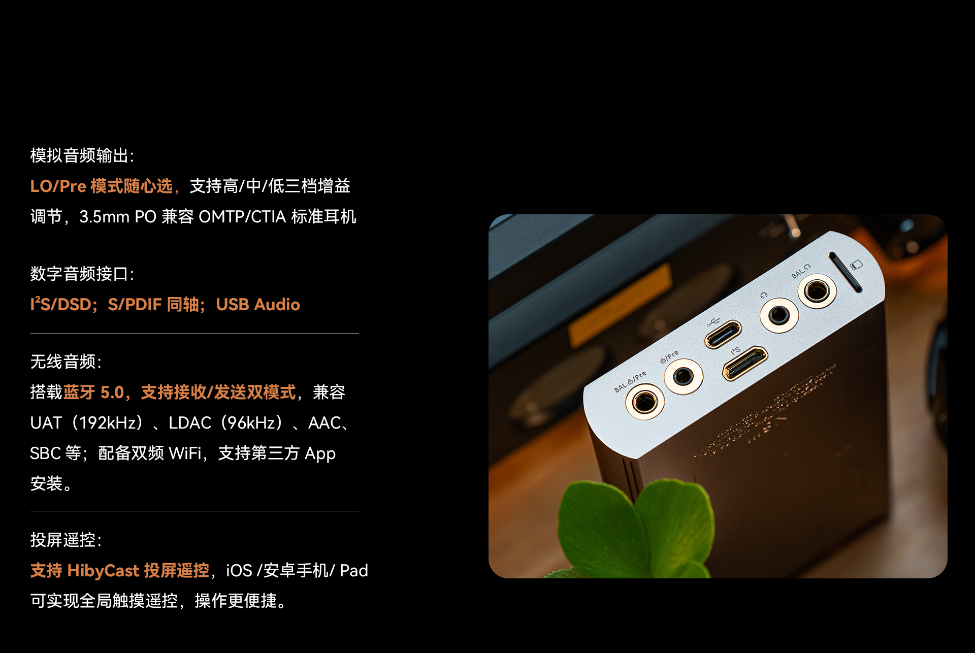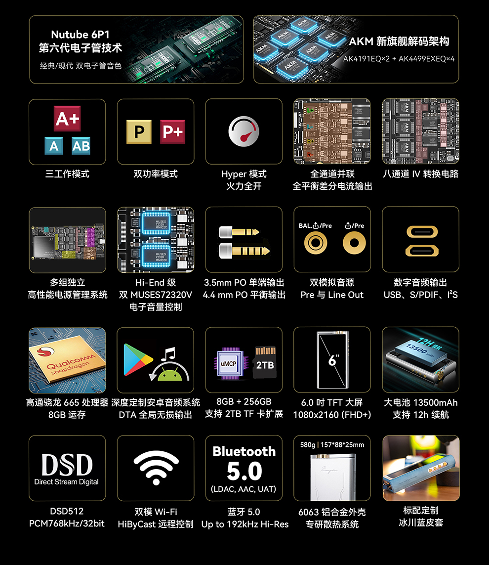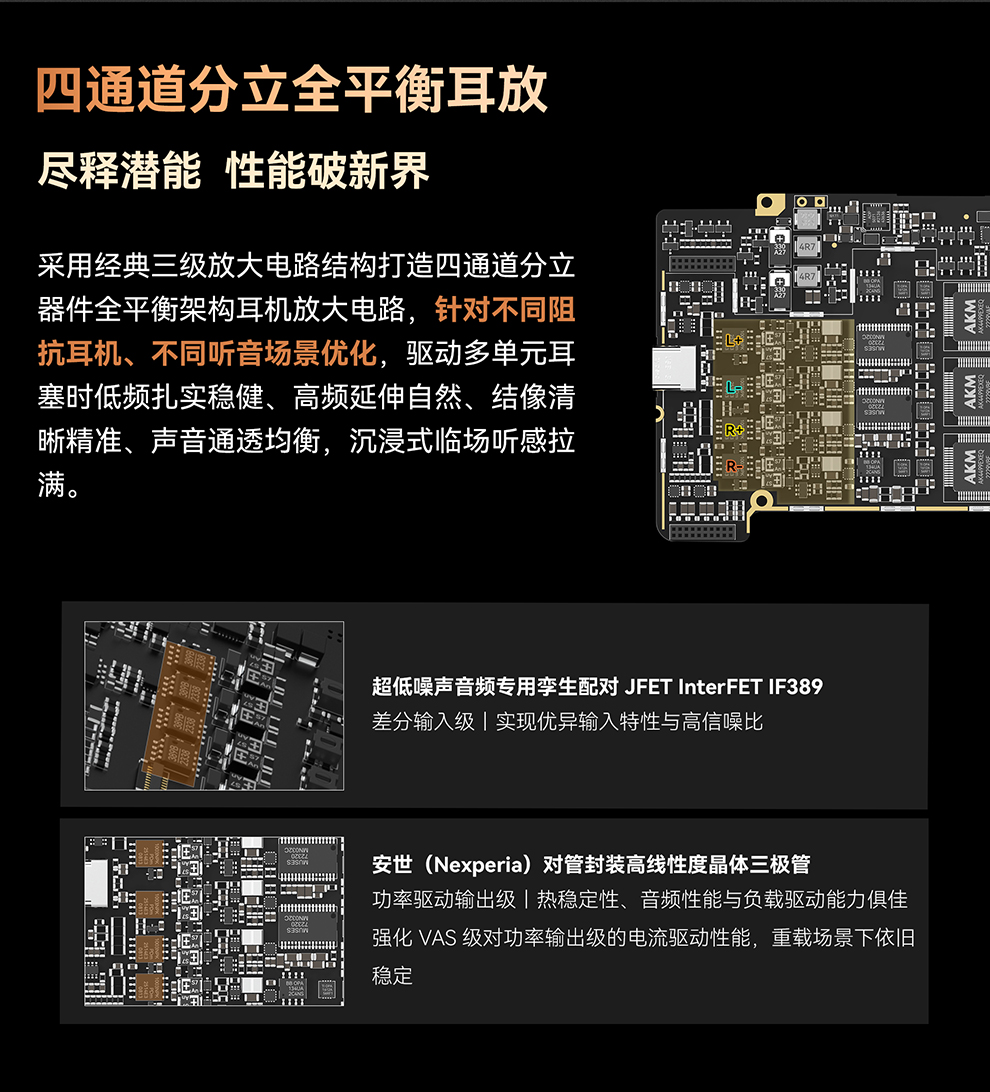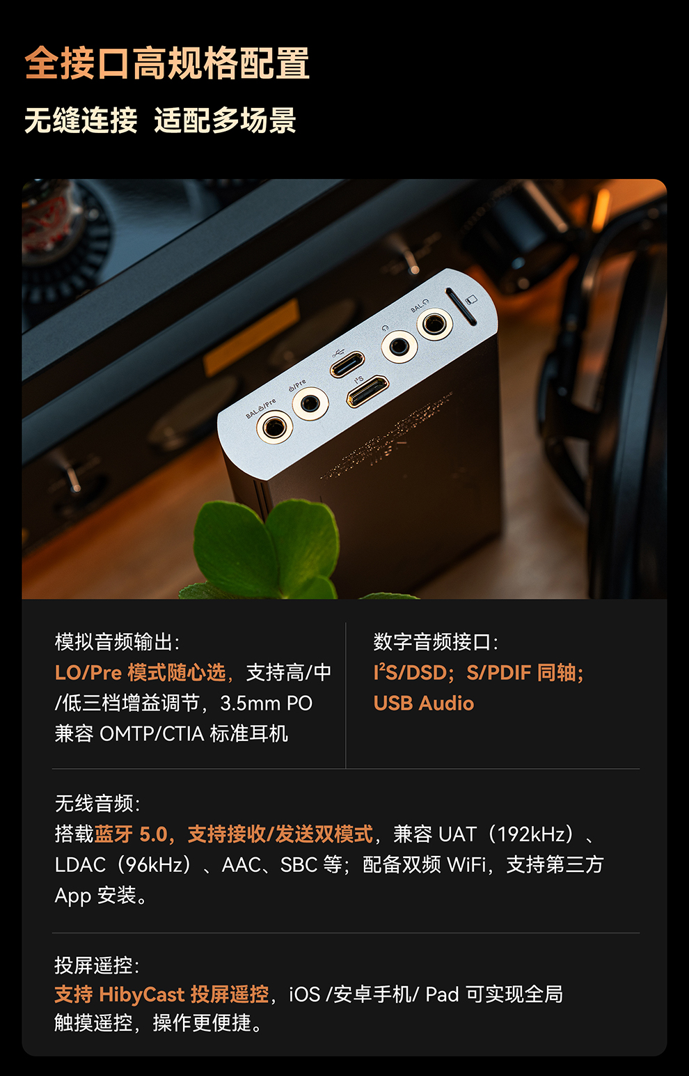 输出。3.5mm 单端/ 4.4mm 平衡、PO/LO/Pre 全模拟输出模式,