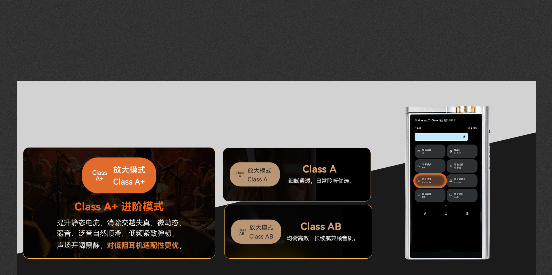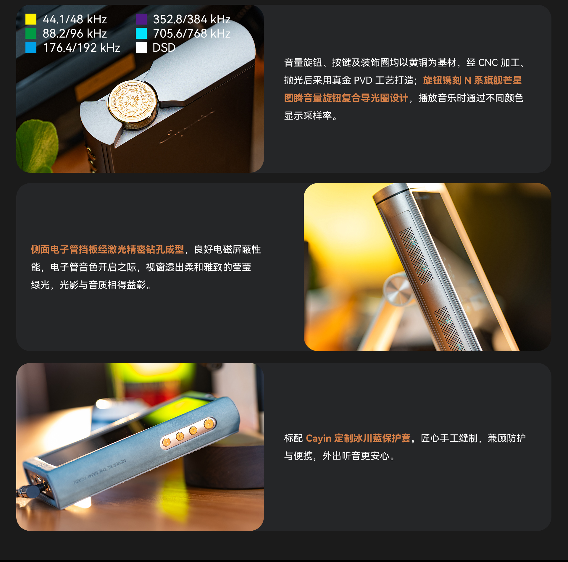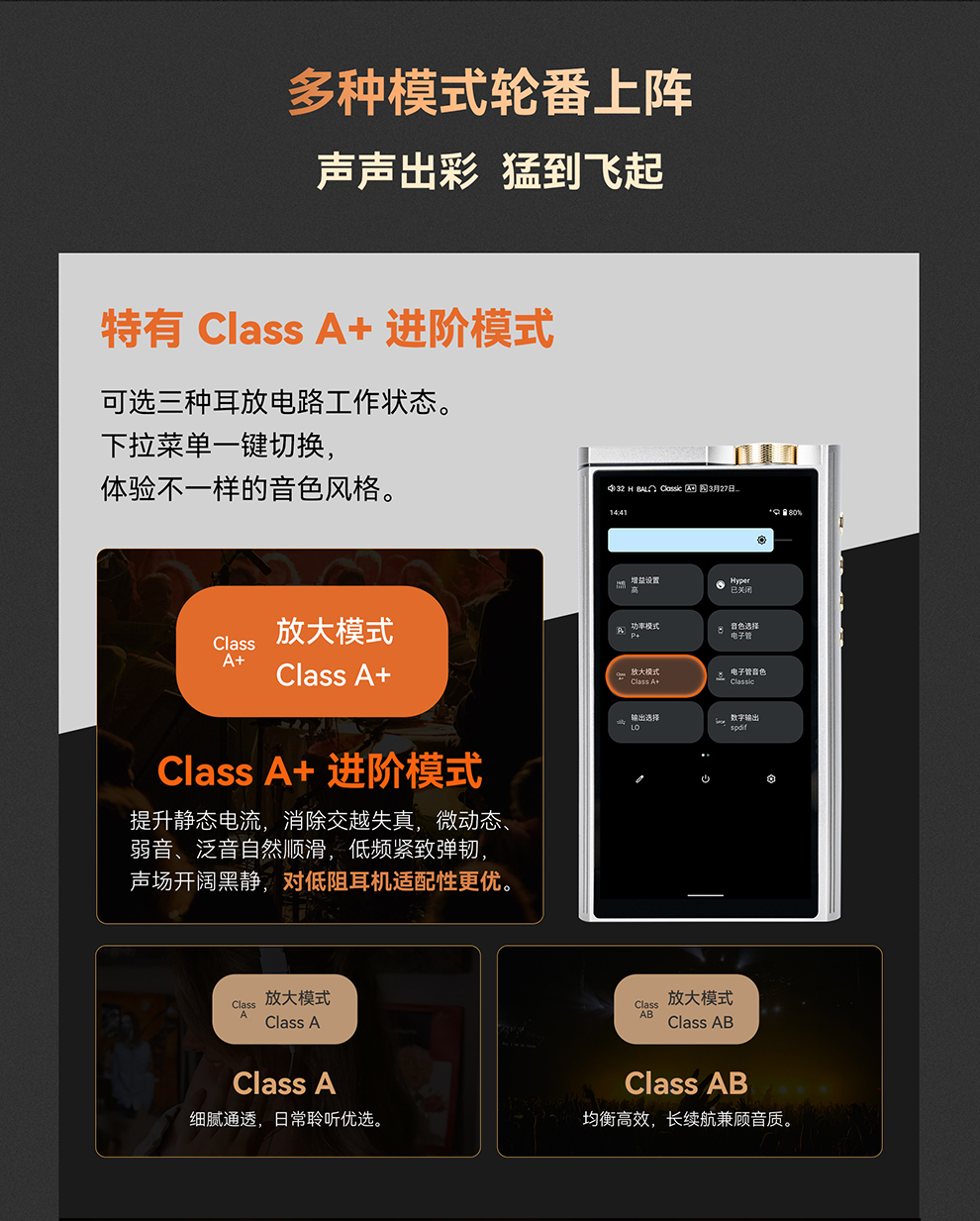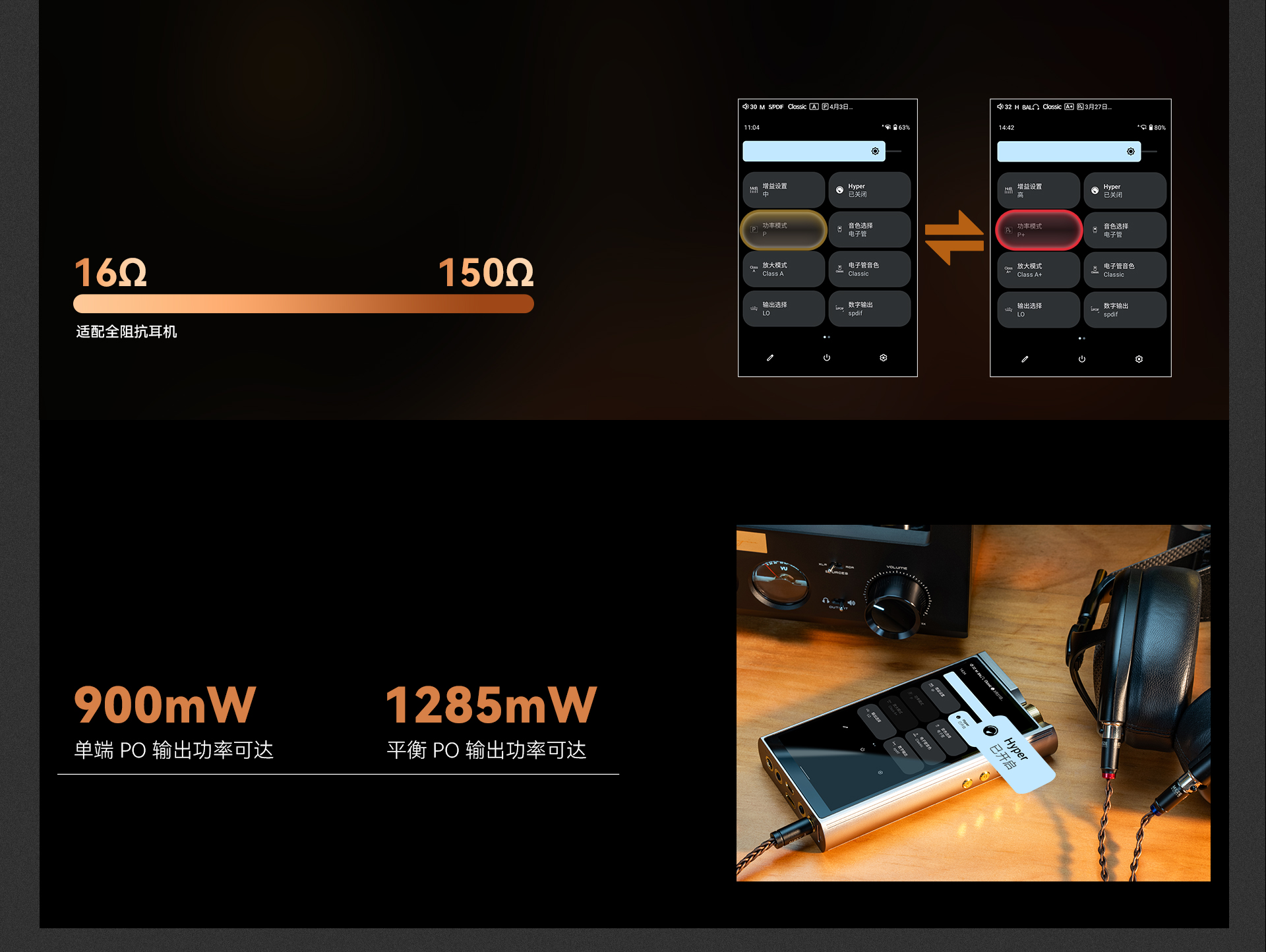 输出。3.5mm 单端/ 4.4mm 平衡、PO/LO/Pre 全模拟输出模式,